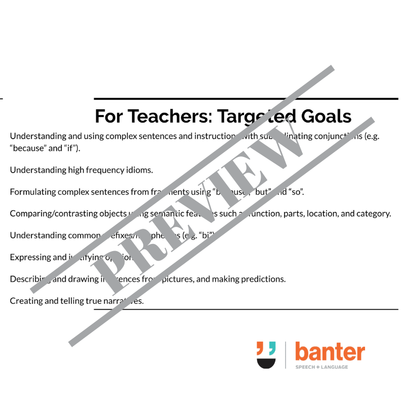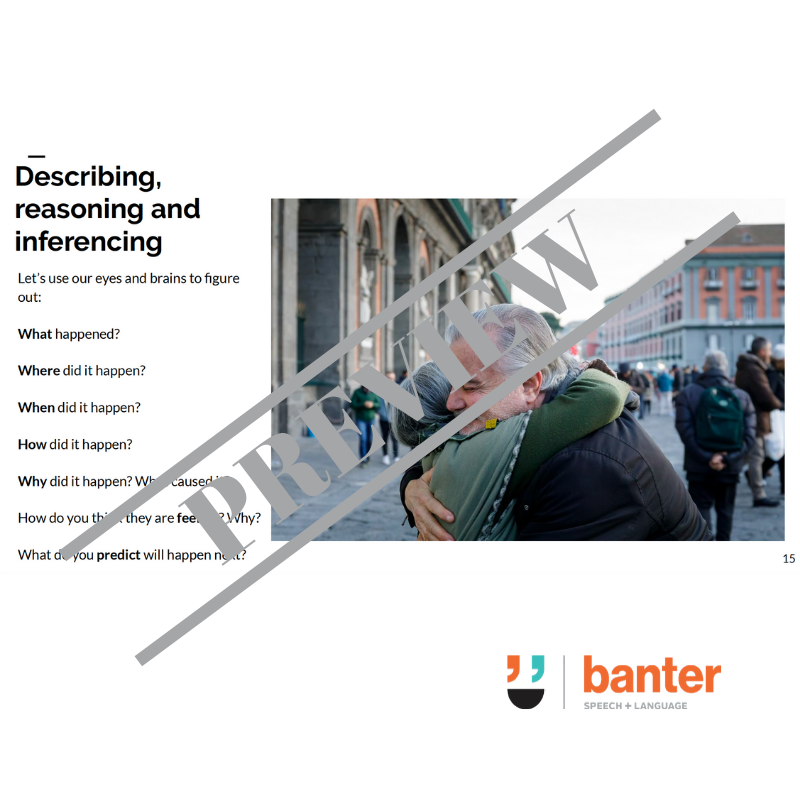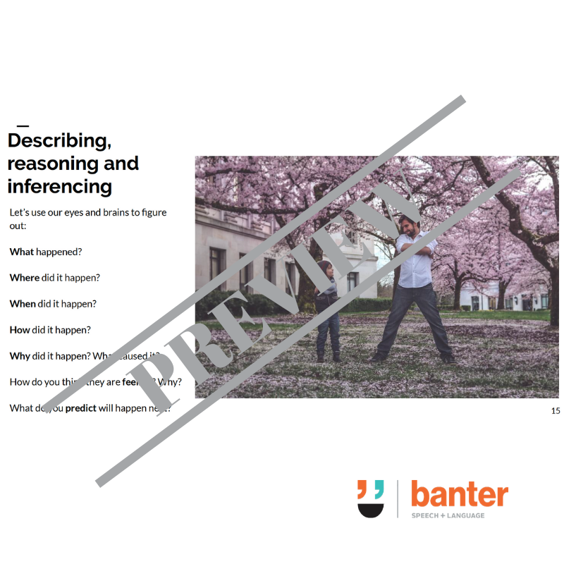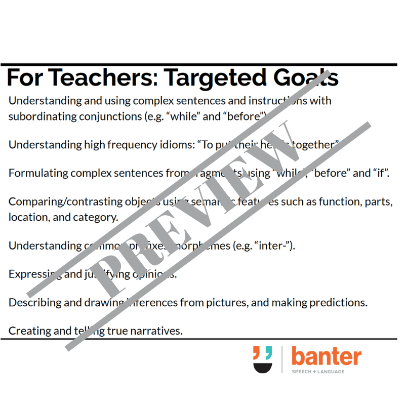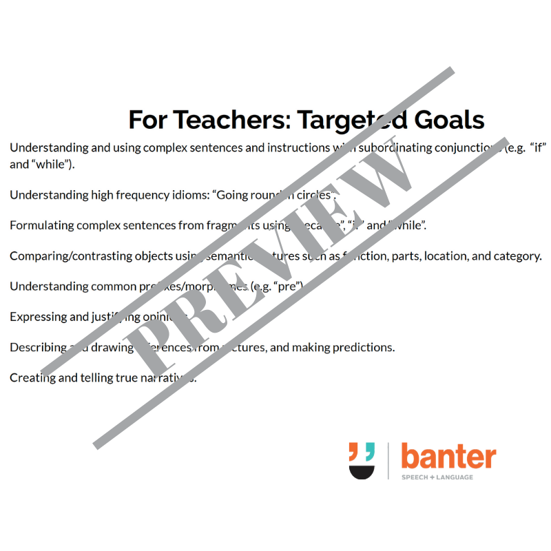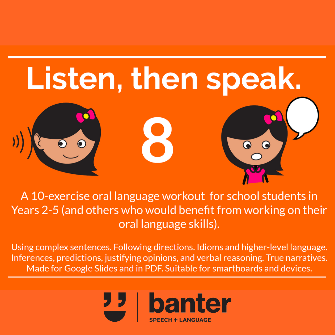 More than 300 pages of fully-scripted oral language exercises. Suitable for one-to-one, small-group, whole class, face-to-face and telehealth instruction. Includes tasks to increase: