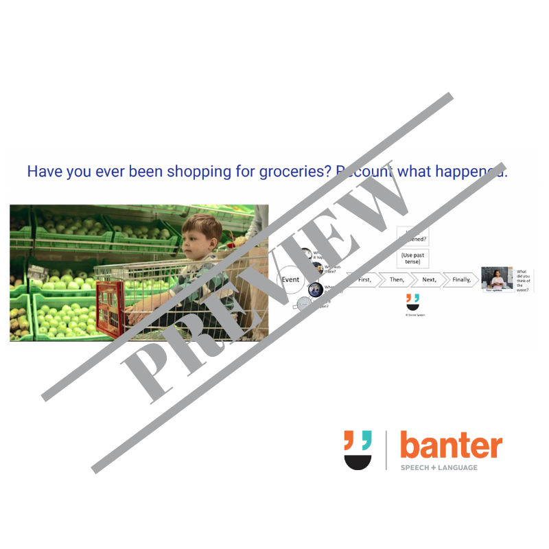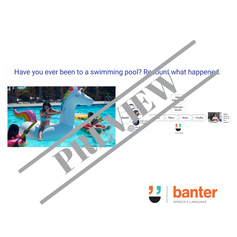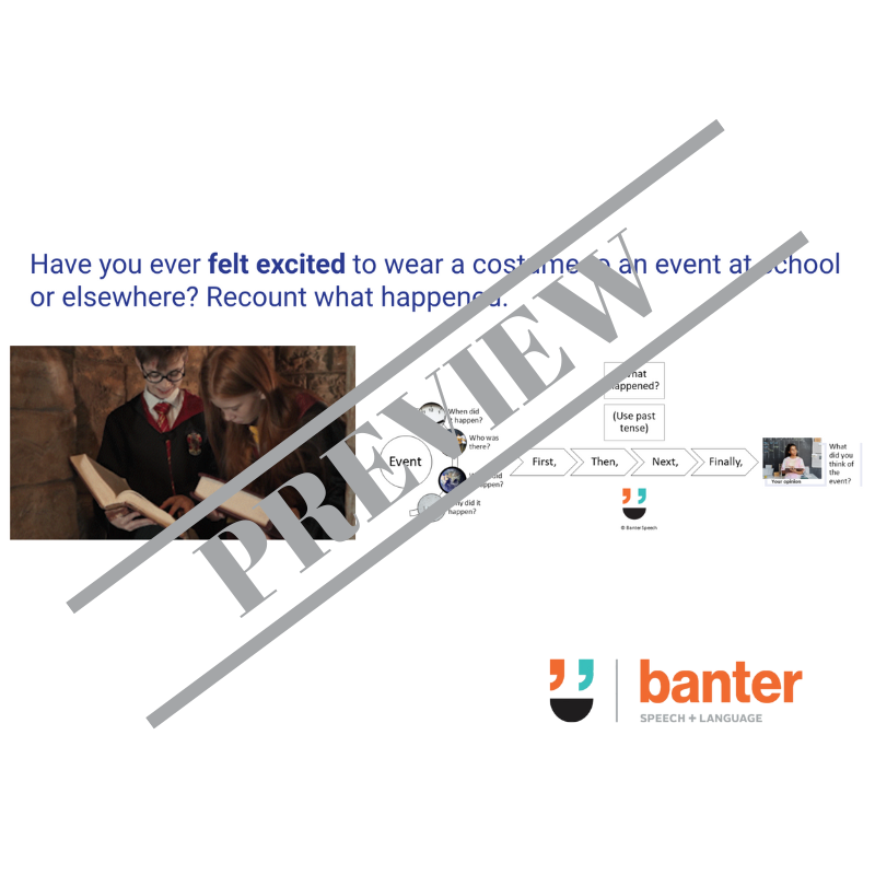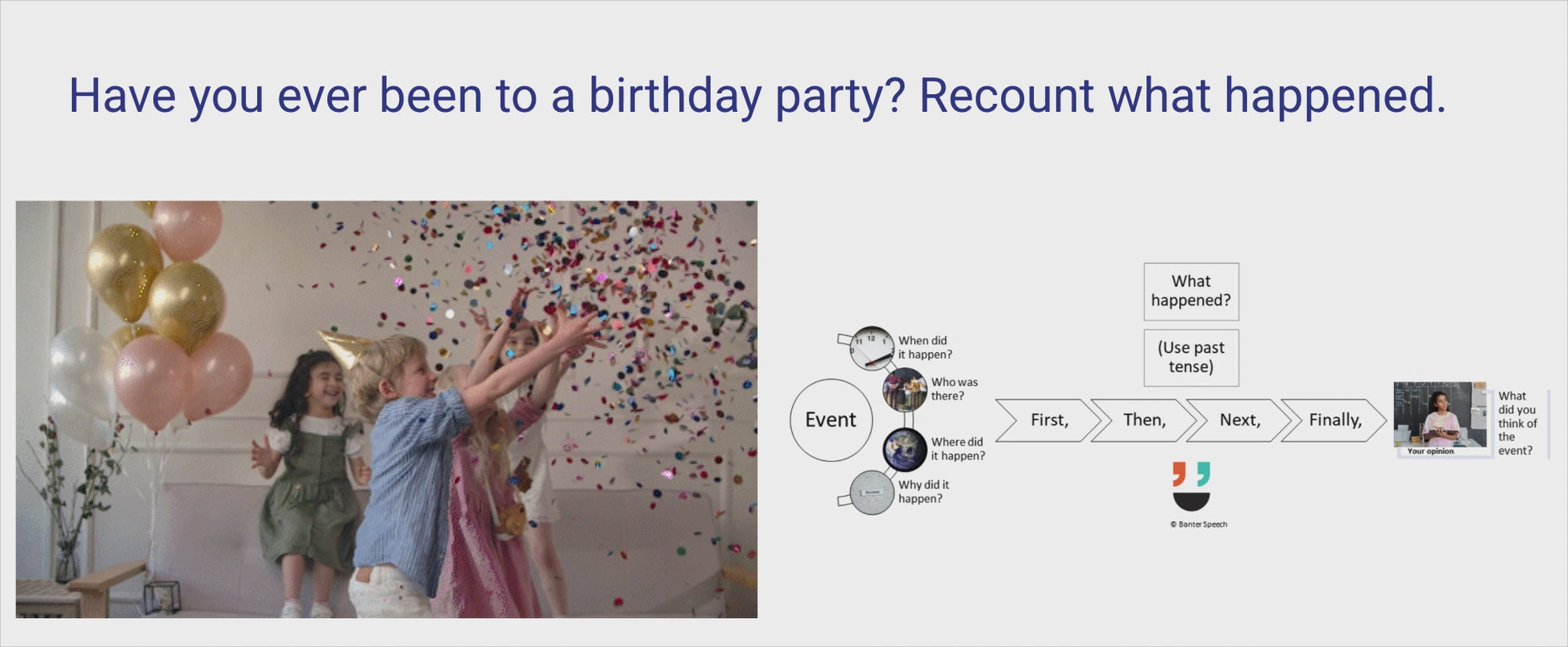 - Ask the child for further information using question prompts (e.g. who, what, where, when, how and why prompts), and/or the visual scaffolding (e.g., first, next, then, finally cues).
